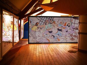 La Salle du Chevalier de Hadoque est située à la fin de l’exposition "Les Secrets de Moulinsart" (dans les communs du Château).